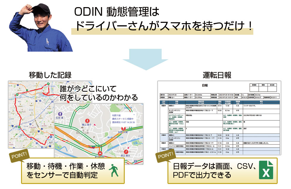 多くの会社様が効率化を実感!株式会社トクソーイノベーション代表取締役吉中清様。(神奈川県 陸送業)。日報の作成時間が30分から15分に。日報を作成するのにこれまでは、ドライバーが帰ってきてから作成していた。ODINのアプリを導入してからは運転日報がある程度自動で作成されるので、最低限の入力で作成できるようになった。位置情報を活用することでお客様の問い合わせにすぐ対応できるようになった。 株式会社仲山運送代表取締役、遠藤佳代子様。(群馬県 配送業)。日報の作成時間が10分短縮。以前はドライバーが戻ってきてからどこに何時に行って、どこで何分休憩したかを思い出しながら日報を書いていたので、時間がかかっていた。また、動態管理でドライバーの位置情報と車に乗っているのか、降りて歩いているのかを確認できるのが便利だ。位置情報などのシステムは、ドラレコやデジタコなど様々あるが、費用的に検討を行わなかった。ODINが費用的に安価だったので導入した。