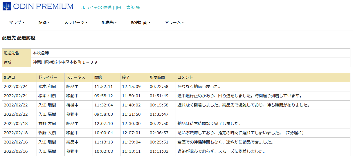 • 配送先ごとに1回の配送での「配送日、配送したドライバー名、作業ステータス名、開始時刻、終了時刻、所要時間、コメント」が記録される