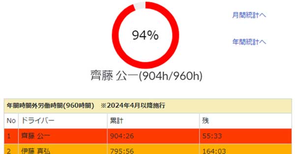 • 上限の960時間まで近いドライバーをわかりやすく表示
