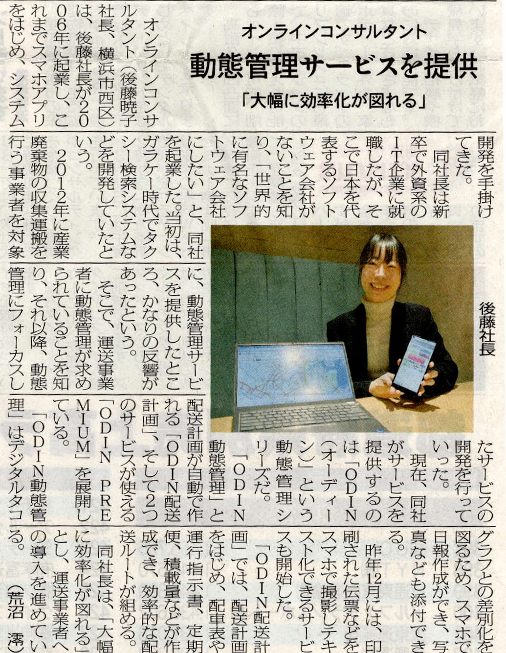 2025年2月13日付の物流Weeklyに「動態管理サービスを提供 大幅に効率化が図れる」という社長インタビューが掲載されました。 ODIN(オーディーン) 動態管理について 詳しく知りたい、まずは試してみたいなどお気軽にお問い合わせください。